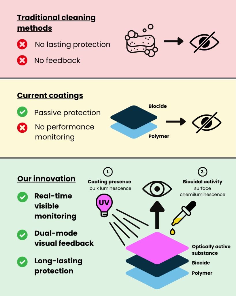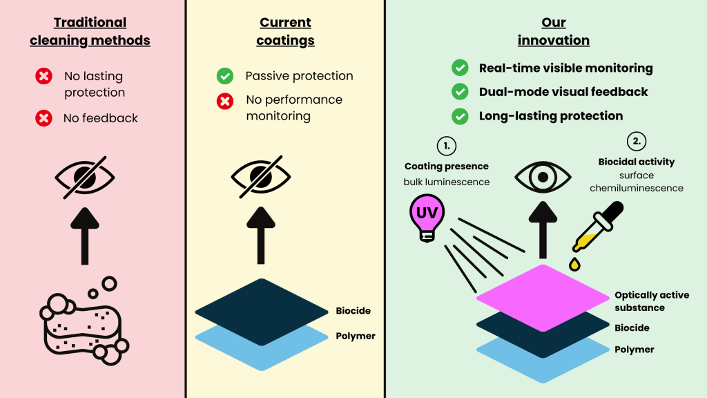 We are developing intelligent coatings that bring visibility to hygiene. Our luminescent antimicrobial technology combines long-lasting biocidal protection with optical feedback — so users can instantly verify coating integrity and effectiveness.